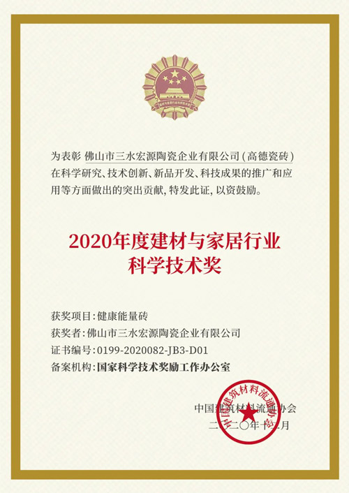 ▲ 高德瓷砖荣获2020年建材与家居行业科学技术奖