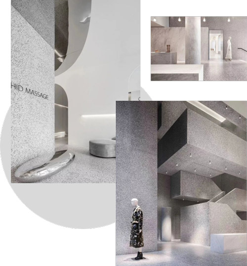 在罗马和纽约的旗舰店都运用了灰色的水磨石,