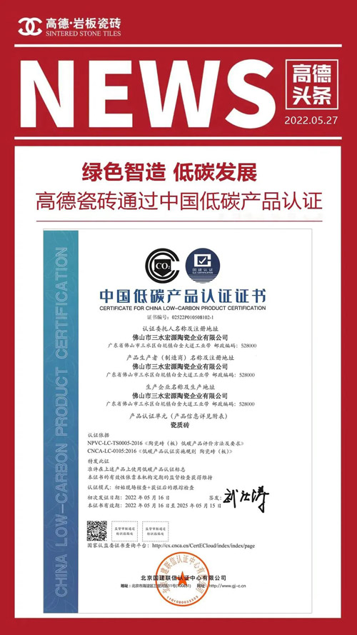 ▲ 高德瓷砖通过中国低碳产品认证
