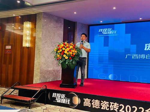 在本次财富峰会现场特别邀请了两位与高德瓷砖同行多年的优秀经销商代表:广西博白高德瓷砖总经理庞富强以及山东潍坊高德瓷砖总经理牟英超,他们分别以新、老经销商的角度分享了与高德品牌合作的经历,分享了在行业寒冬下,与高德品牌携手奋进的致富经验。