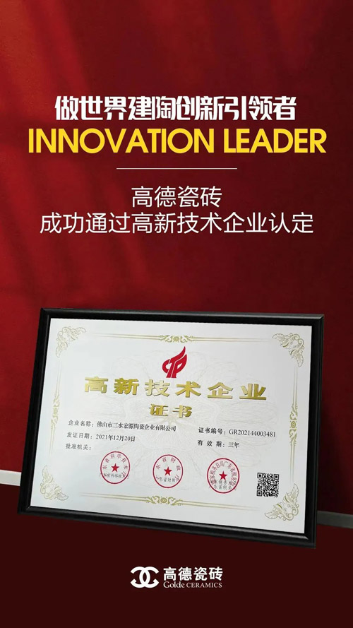 凭借着在产品品质、品控标准、管理体系等方面的突出表现,高德瓷砖成功顺利通过高新技术企业认定,并成为“佛山标准产品企业”。