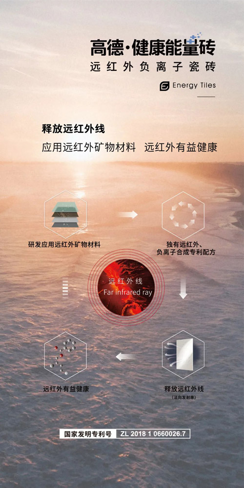 自“健康战略”成为高德瓷砖发展的核心战略之一后,高德·健康能量砖便开创了行业功能性瓷砖新品类,成为市场上唯一一款集远红外线和负氧离子于一体的健康瓷砖。高德·健康能量砖的核心技术“远红外负离子专利合成配方”不仅荣获国家发明专利(专利号:ZL 2018 1 0660026.7),产品更获得中国平安保险公司的承保。
