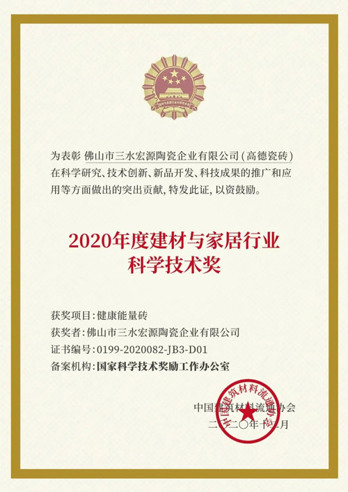 ▲高德瓷砖荣获2020年建材与家居行业科学技术奖