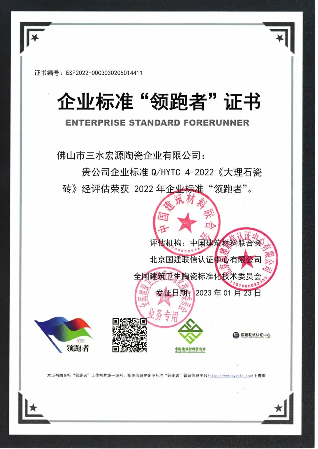 2023年1月,高德瓷砖企业标准Q/HYTC 4-2022《大理石瓷砖》经评定机构评估,入选2022年企业标准“领跑者”名单并获颁证书。