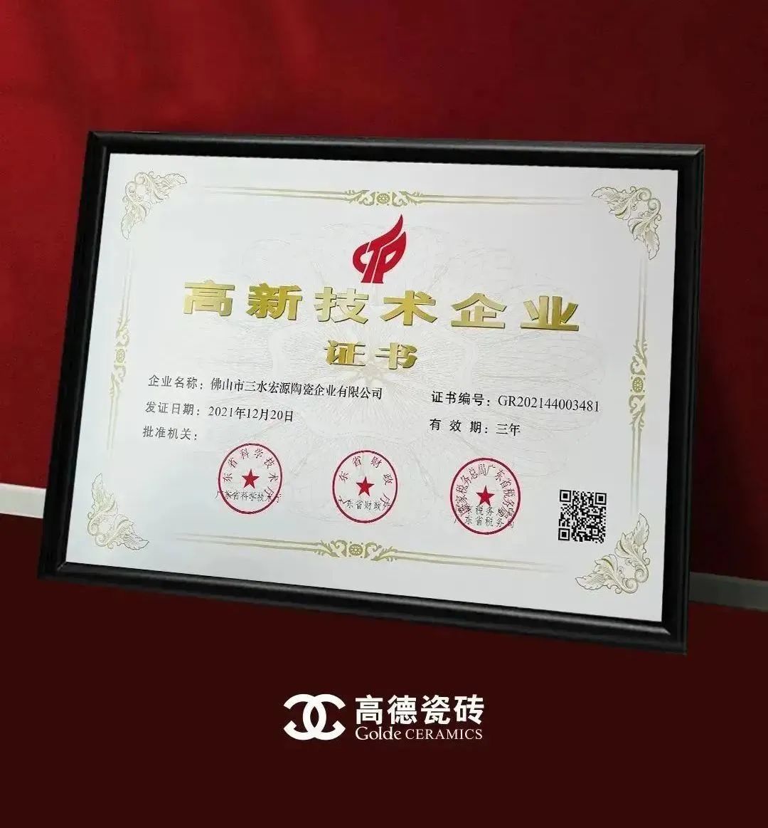 历年来,高德瓷砖不断发挥匠心精神进行研发、创新、升级,不断提高品牌核心竞争力,获得了“高新技术企业”“专精特新企业”“建材与家居行业科学技术奖”“技术一等奖”等多项重磅荣誉。