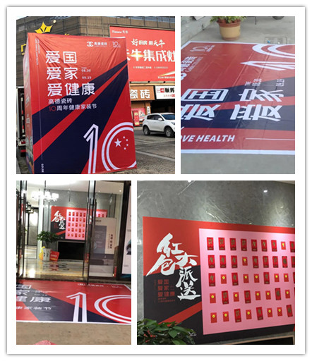 活动期间,高德全国经销商门店将组织团队人员穿着统一的高德十周年纪念服装,在商场、广场、小区等地进行快闪推广活动,进行品牌形象展示。形式以舞蹈、赠送小礼品等为主,向广大业主宣传本次活动内容以及爱国情怀。为回馈每一位客户的选择,活动期间高德全国门店将组织工作人员对老客户进行上门回访,为老客户提供免费瓷砖护理服务,进行负氧离子含量检测,邀请老客户成为高德·健康能量砖的健康代言人,以切实的行动回馈客户。