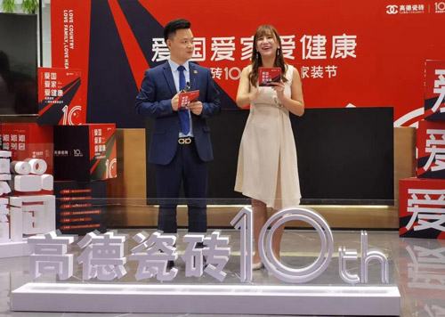 高德十周年直播盛典由广东广播电视台主持人任姗姗担任主播,并邀请高德瓷砖销售总经理王孝红亲临直播间。王总在直播间中表达了对高德十周年的感想,并向全国的用户朋友们致以衷心的感谢,谢谢他们与高德瓷砖相随相伴十年。