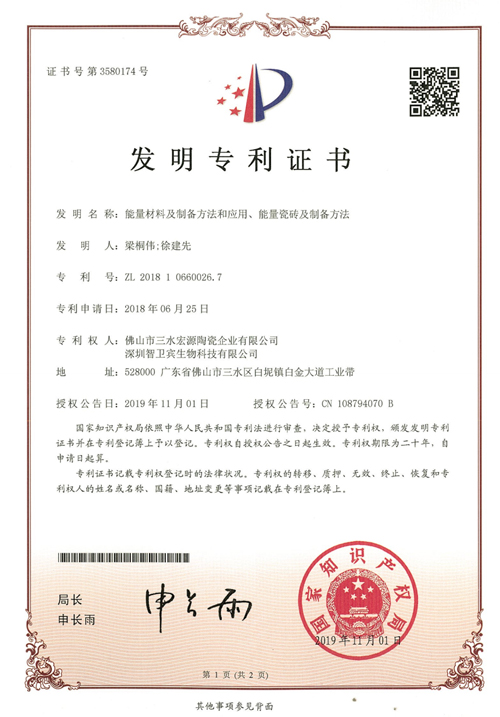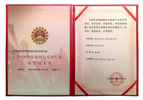大会公布了2020年度建材与家居行业科学技术奖和专利奖的获奖名单,其中,高德·健康能量砖的核心发明专利技术获得“科学技术奖”殊荣,力证高德瓷砖在产品创新的道路上永不停歇。