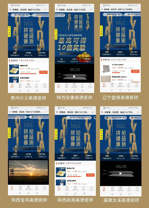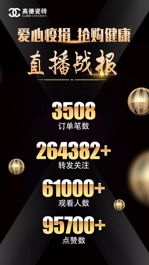 疫情期间,高德瓷砖总部联合全国经销商率先策划3.12“爱心疫捐·抢购健康”线上裂变直播活动,直播间人气火爆,吸引了61000+用户观看,获得95700+点赞,成功拿下3508笔订单,战绩斐然。
