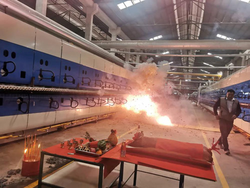 随着鞭炮齐鸣,窑炉被点燃,生产基地岩板瓷砖、岩板生产线全线开窑。