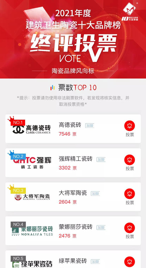 经过两轮共46天的网络投票,高德瓷砖从众多优秀陶瓷品牌的紧张激烈角逐中脱颖而出,一举摘得“陶瓷一线品牌”、“消费者喜爱十大品牌”两项桂冠,成为榜单中为数不多的同时获得两项大奖的品牌。