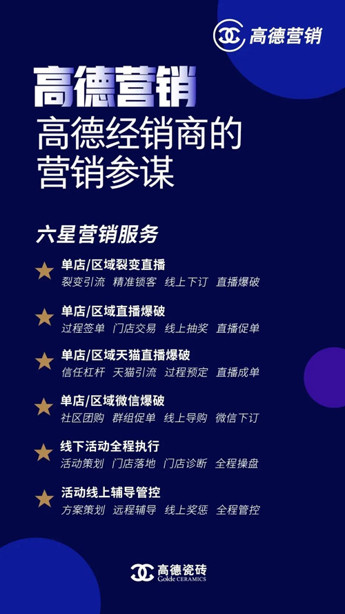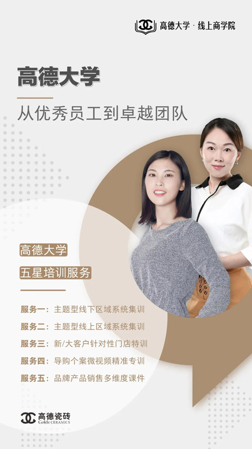 从陶瓷小白到行业资深导购,高德“五星培训”体系,全程帮扶,助力成长。主题型线上/线下区域系统集训,新/大客户门店特训,导购个案微视频精准专训,品牌产品销售多维度培训,总部讲师团队, 一对一帮你建团队,让您安心当老板!