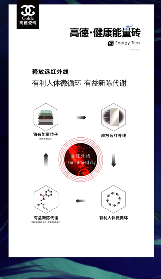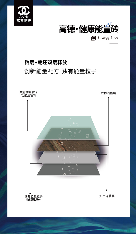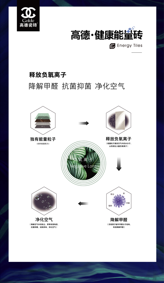 高德·健康能量砖是高德瓷砖匠心研发的一款行业首创高科技功能性瓷砖产品,荣获国家发明专利,专利号:ZL 2018 1 0660026.7。高德·健康能量砖采用创新能量配方,独有能量粒子,具有“释放远红外线,有利人体微循环,有益新陈代谢”和“释放负氧离子,降解甲醛、抗菌抑菌、净化空气”两大功能。