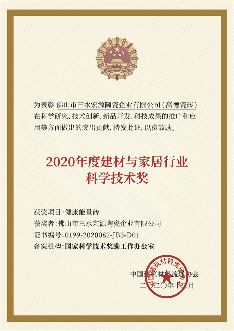 2020年度建材与家居行业科学技术奖证书