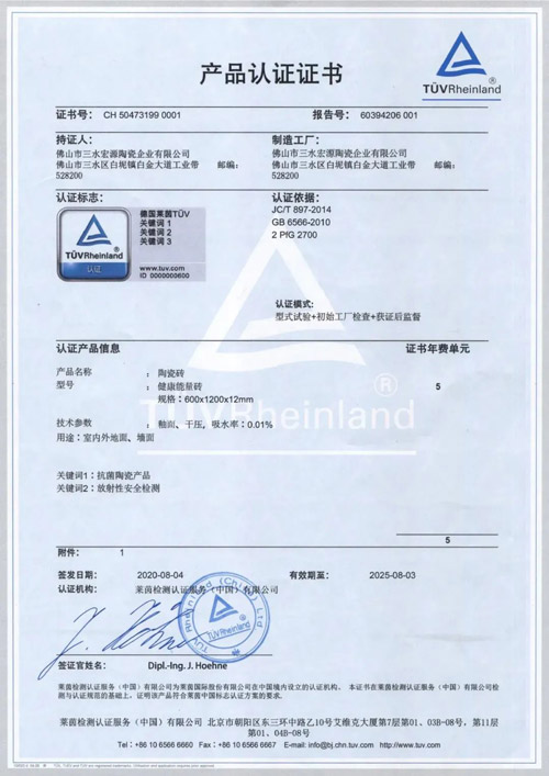 ▲ 德国莱茵TüV“抗菌陶瓷制品认证证书