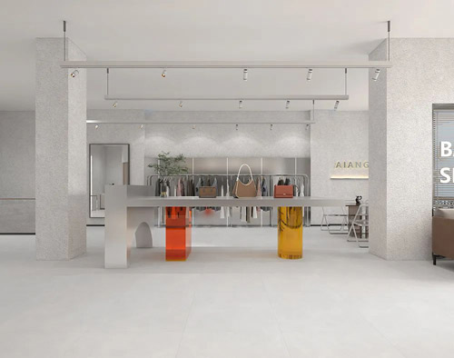 在罗马和纽约的旗舰店都运用了灰色的水磨石,