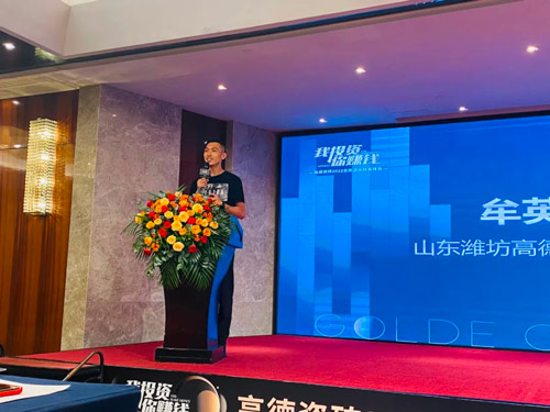 在本次财富峰会现场特别邀请了两位与高德瓷砖同行多年的优秀经销商代表:广西博白高德瓷砖总经理庞富强以及山东潍坊高德瓷砖总经理牟英超,他们分别以新、老经销商的角度分享了与高德品牌合作的经历,分享了在行业寒冬下,与高德品牌携手奋进的致富经验。