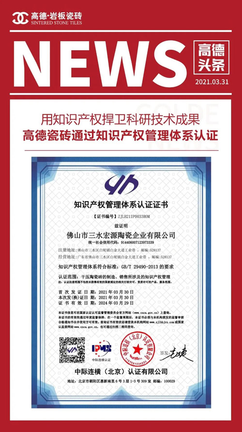 洞见行业发展的趋势,高德瓷砖把精耕理念落到实处。高德瓷砖相继通过了ISO9001质量管理体系认证、环境管理体系认证、职业健康管理体系认证、知识产权管理体系认证,为产品研发与生产提供了坚实的系统保障。