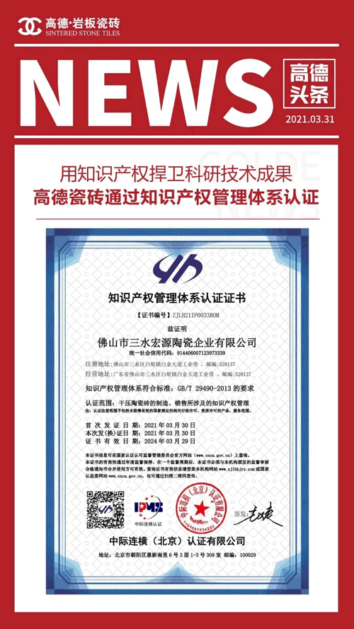 创新的管理模式一直在引领高德瓷砖往品牌精耕的路上前行。依托创新的管理模式,高德瓷砖相继通过了ISO9001质量管理体系认证、环境管理体系认证、职业健康管理体系认证、知识产权管理体系认证等权威体系认证。