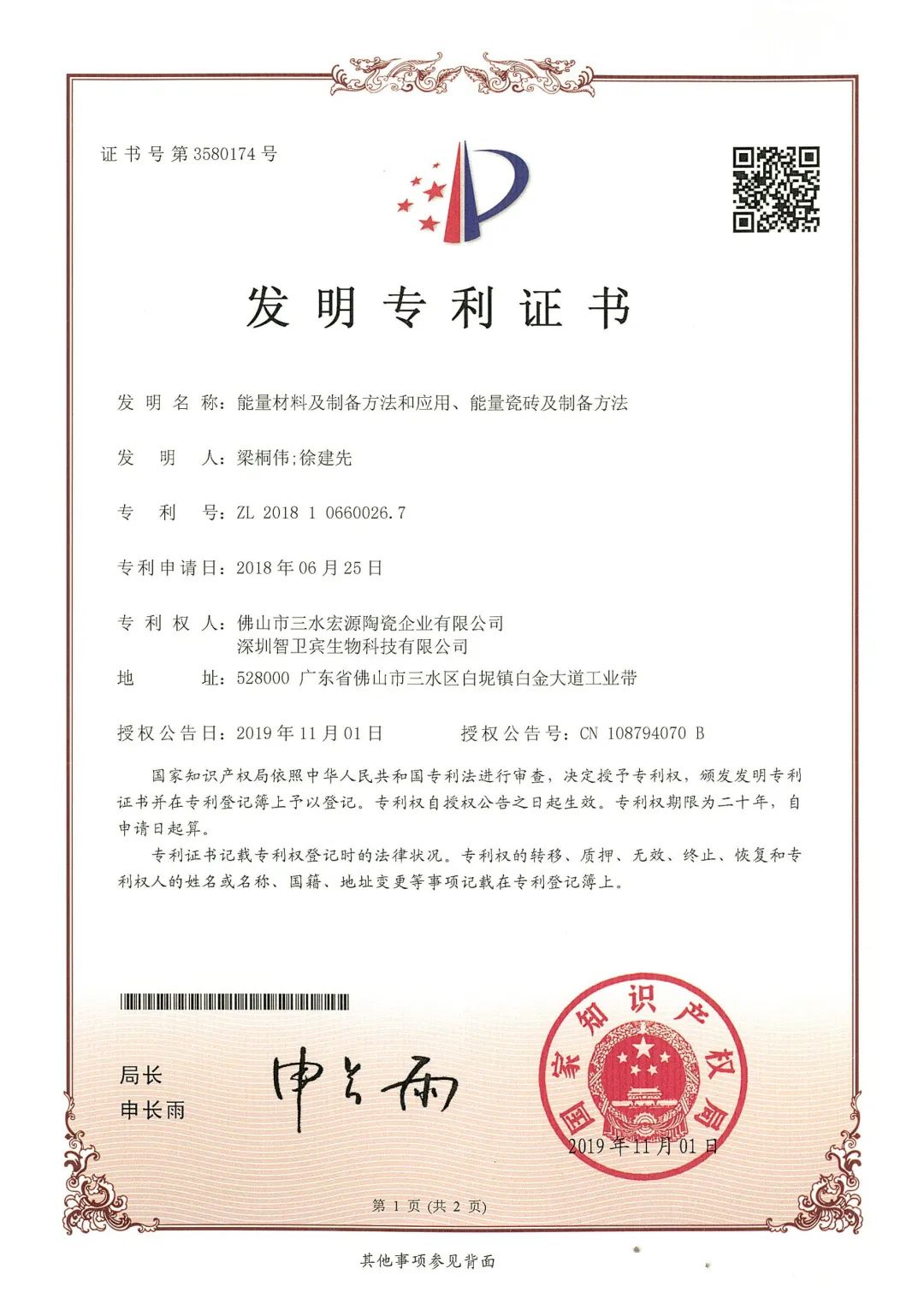 早在2015年高德瓷砖就正式启动了“健康战略”,在2018年推出多功能健康产品,开创行业健康功能性瓷砖新品类,其核心配方技术荣获国家发明专利,专利号ZL 2018 1 0660026.7。