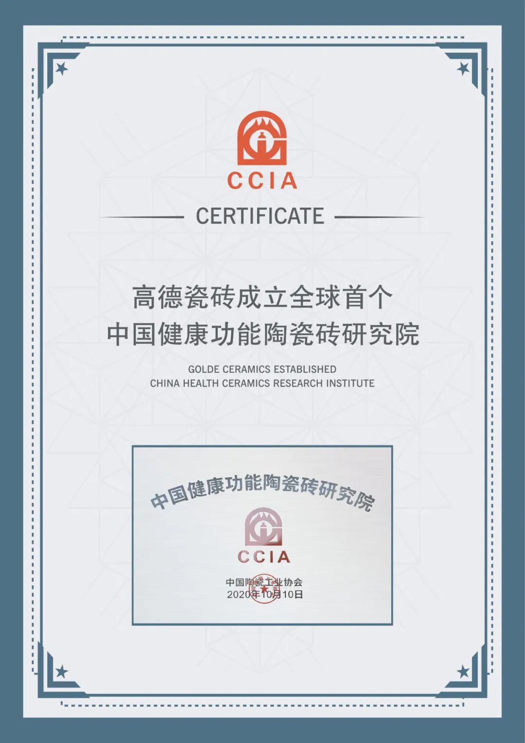 2020年10月,全球首个“中国健康功能陶瓷砖研究院”落户高德瓷砖,推动健康瓷砖研究标准从无到有,促进行业发展进入规范化、标准化步道。