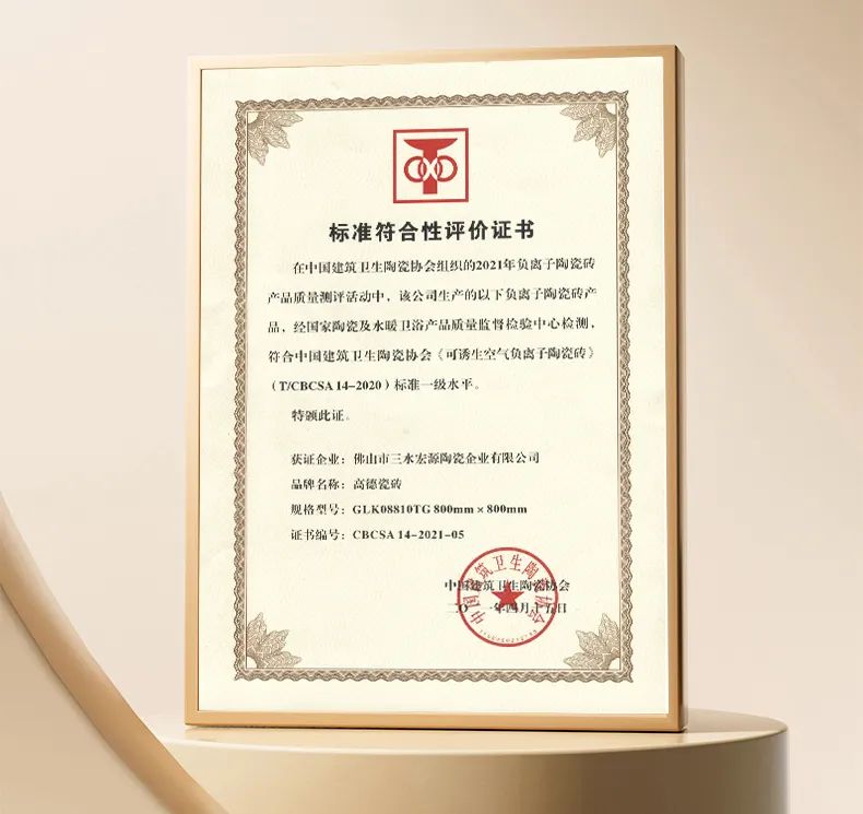 2021年4月,高德·健康能量砖负氧离子释放功效经中国建筑卫生陶瓷协会测评,达到《可诱生空气负离子陶瓷砖》标准一级水平。