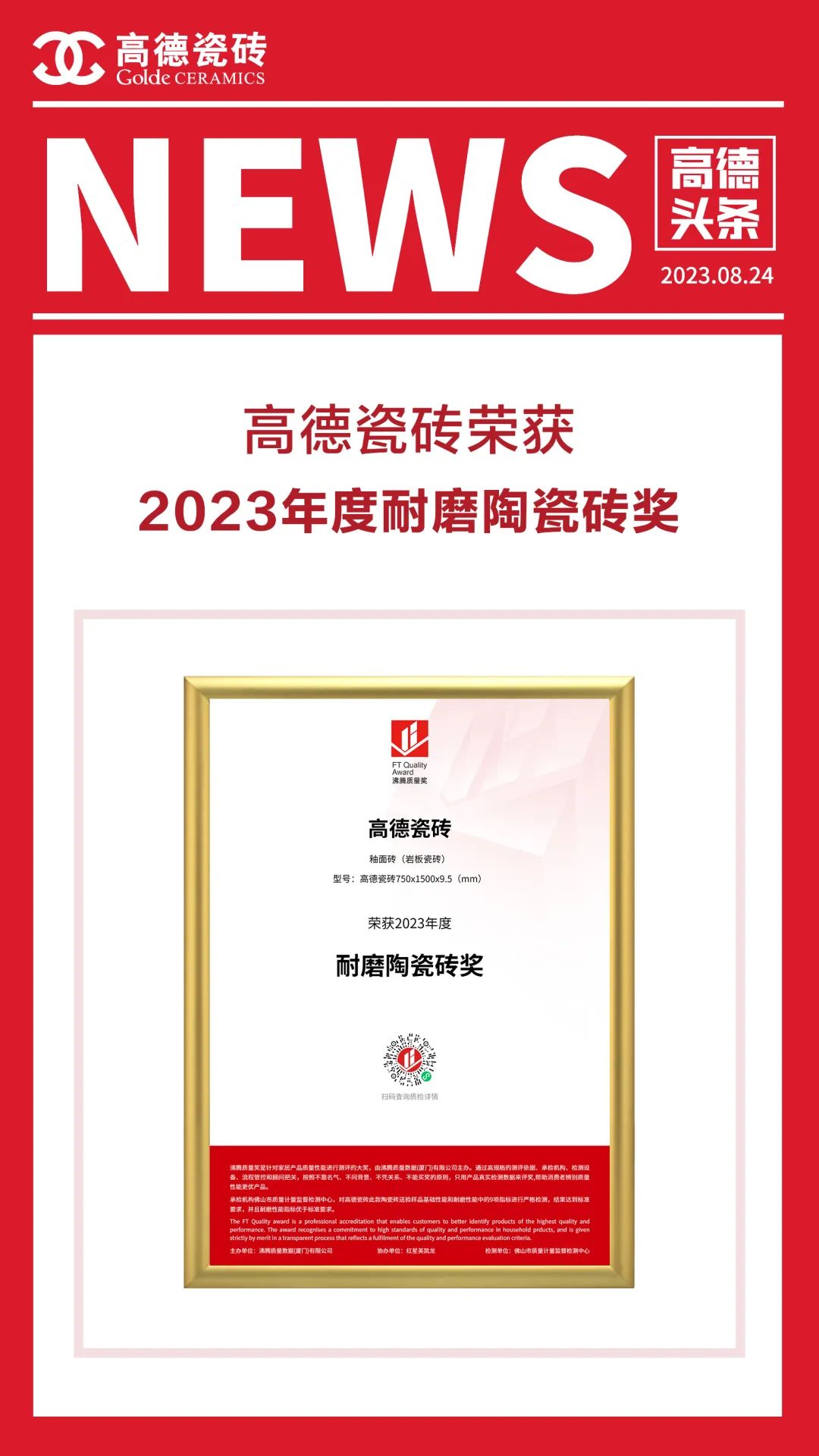 高德瓷砖凭借卓越质量实力和精工产品品质,获得2023年度“耐磨陶瓷砖奖”荣誉,这是高德瓷砖的品质实力,更是对高德十三年品质坚守的认可。