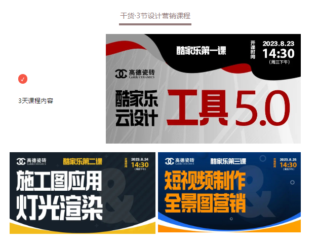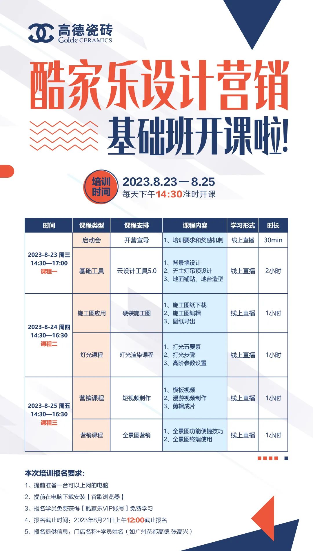 为进一步提升终端门店的设计能力,打造一流服务团队,高德瓷砖总部联合酷家乐针对终端门店组织为期3天的“高德瓷砖·酷家乐设计营销基础班”全国线上特训。