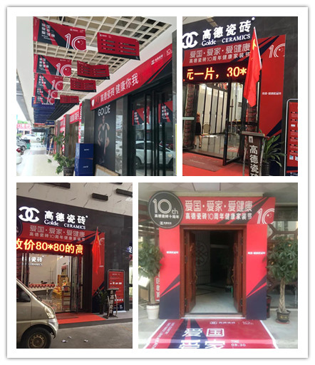 活动期间,高德全国经销商门店将组织团队人员穿着统一的高德十周年纪念服装,在商场、广场、小区等地进行快闪推广活动,进行品牌形象展示。形式以舞蹈、赠送小礼品等为主,向广大业主宣传本次活动内容以及爱国情怀。为回馈每一位客户的选择,活动期间高德全国门店将组织工作人员对老客户进行上门回访,为老客户提供免费瓷砖护理服务,进行负氧离子含量检测,邀请老客户成为高德·健康能量砖的健康代言人,以切实的行动回馈客户。