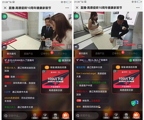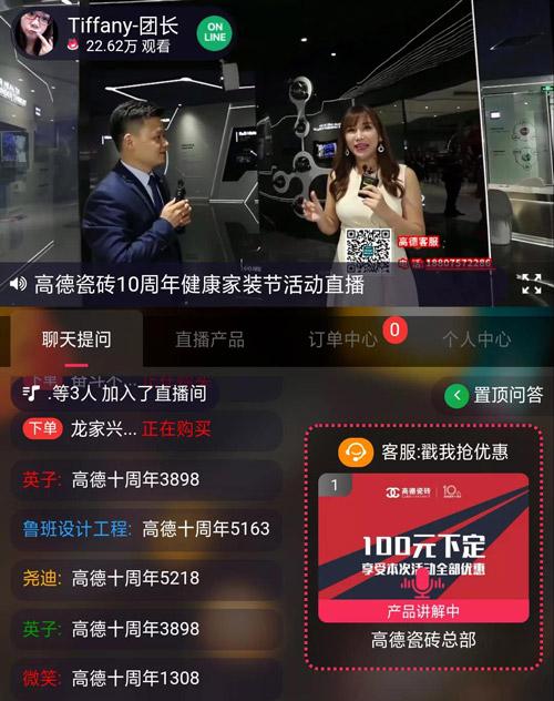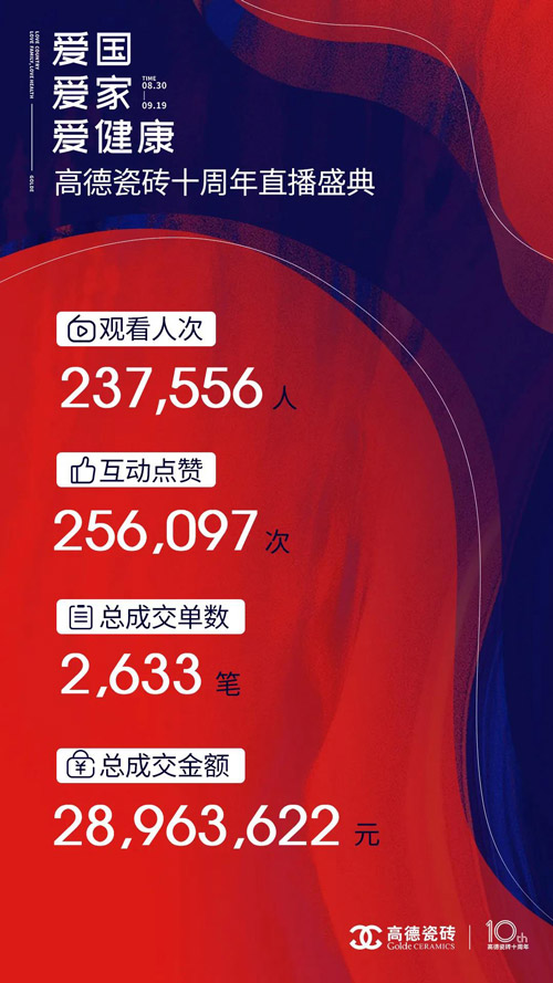 持续21天的“高德瓷砖10周年健康家装节”在当晚迎来高潮,直播间中订单不断。截止到直播结束,本次活动总成交单数共计2633笔,总成交金额28,963,622元,活动圆满成功。