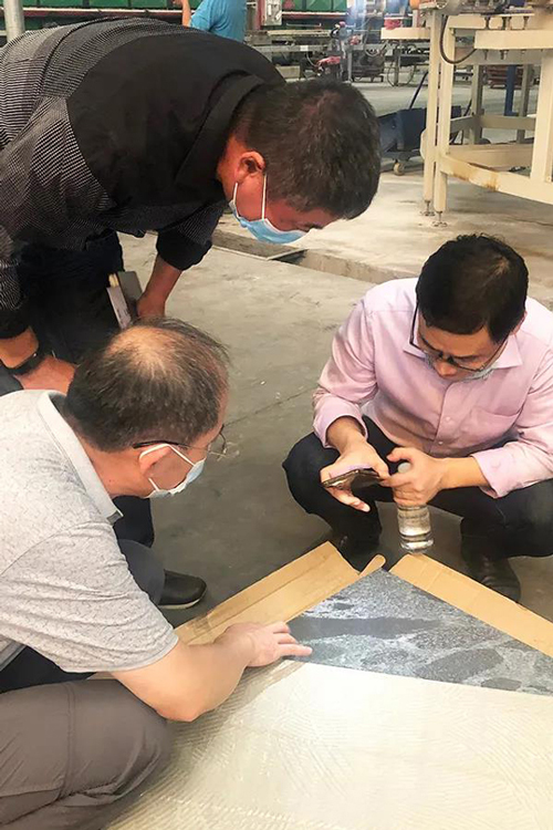 随后,研究专家组走进高德瓷砖生产车间,检视各个生产环节,并对健康能量砖产品进行了随机抽样,封装保存用于后续检测。本次调研工作到此顺利结束。