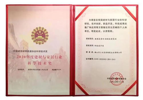 大会公布了2020年度建材与家居行业科学技术奖和专利奖的获奖名单,其中,高德·健康能量砖的核心发明专利技术获得“科学技术奖”殊荣,力证高德瓷砖在产品创新的道路上永不停歇。
