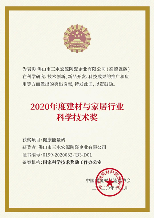 12月13日,高德·健康能量砖的核心发明专利技术获得由国家科学技术奖励工作办公室颁发的“2020建材与家居行业科学技术奖”殊荣,堪称中国建材与家居行业的最高荣誉。