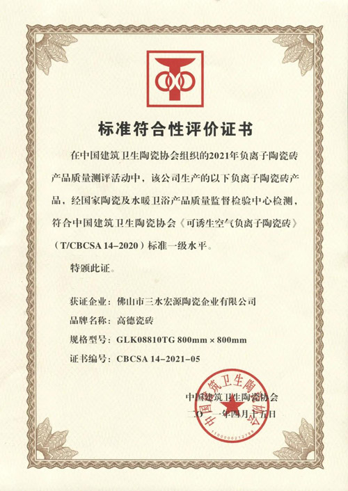经国家级权威检测机构“国家陶瓷及水暖卫浴产品质量监督检验中心”检测,高德·健康能量砖产品符合中国建筑卫生陶瓷协会《可诱生空气负离子陶瓷砖》标准一级水平,获得该机构颁发的《标准符合性评价证书》,有力证实了高德·健康能量砖的真实功效。