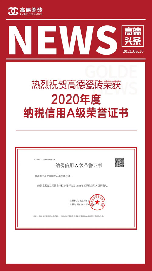 纳税信用级别,是税务机关根据纳税人税务登记情况、纳税申报情况、税款缴纳情况等,就纳税人在一定周期内的纳税信用所评定的级别。其中,A级信用最高,A级纳税人占比也是屈指可数。此次高德瓷砖获评“纳税信用A级”荣誉称号,对企业的稳健发展有着重要意义。