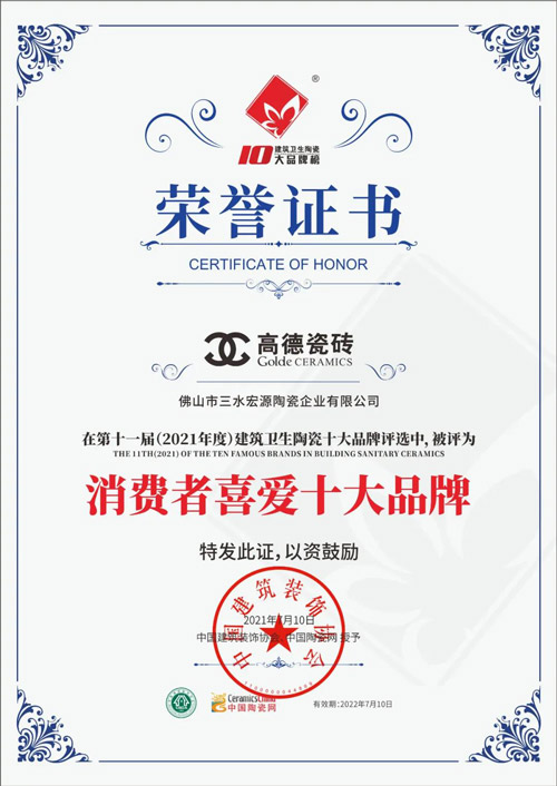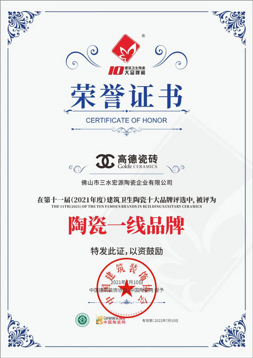 7月10日,由中国建筑装饰协会主办,中国建筑装饰协会材料应用分会和中国陶瓷网承办的2021年度“建筑卫生陶瓷十大品牌榜”以线上发布形式隆重放榜,高德瓷砖凭借雄厚的品牌实力和广泛用户的认可,荣获2021年度“陶瓷一线品牌”、“消费者喜爱十大品牌”双项大奖。
