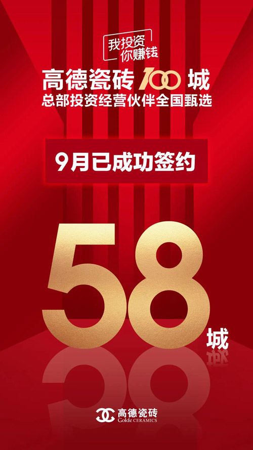 九月伊始,“我投资,你赚钱——高德瓷砖100城总部投资经营伙伴全国甄选”活动在全国范围内火力全开,营销再度升级,成功斩获全国58城!
