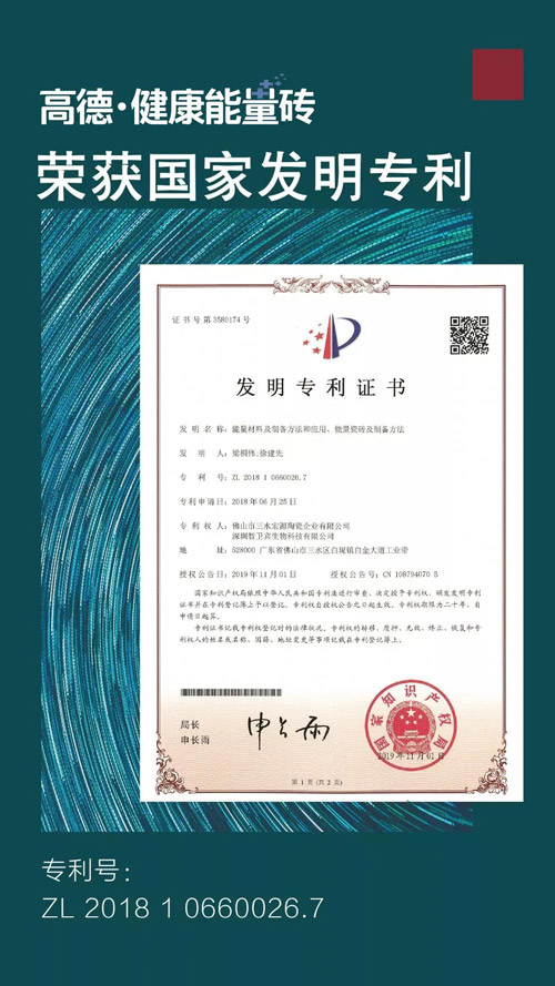 2015年全民健康上升为国家战略,在市场趋势和国家政策引导之下,高德瓷砖快速升级了健康战略,启动“健康能量砖”项目,联合国内顶尖材料专家、科研院校,进行健康瓷砖的项目立项、技术研发。历时三年的技术攻破, 2018 年,由泰斗级国医大师技术顾问的“高德·健康能量砖”强势推出市场,开创行业健康功能性瓷砖新品类,其核心配方技术荣获国家发明专利,专利号ZL 2018 1 0660026.7。
