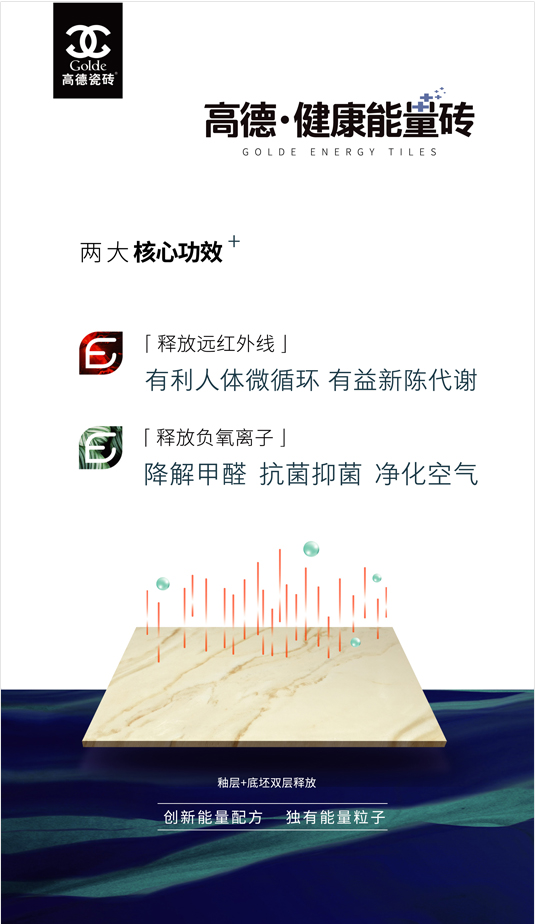 高德·健康能量砖是高德瓷砖匠心研发的一款行业首创高科技功能性瓷砖产品,荣获国家发明专利,专利号:ZL 2018 1 0660026.7。高德·健康能量砖采用创新能量配方,独有能量粒子,具有“释放远红外线,有利人体微循环,有益新陈代谢”和“释放负氧离子,降解甲醛、抗菌抑菌、净化空气”两大功能。