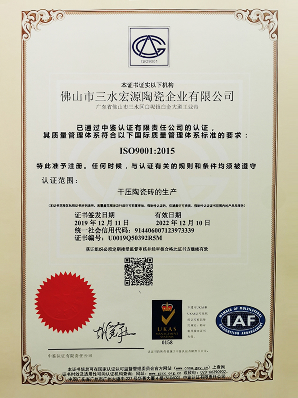 2020年佛山陶瓷原产地认证证书